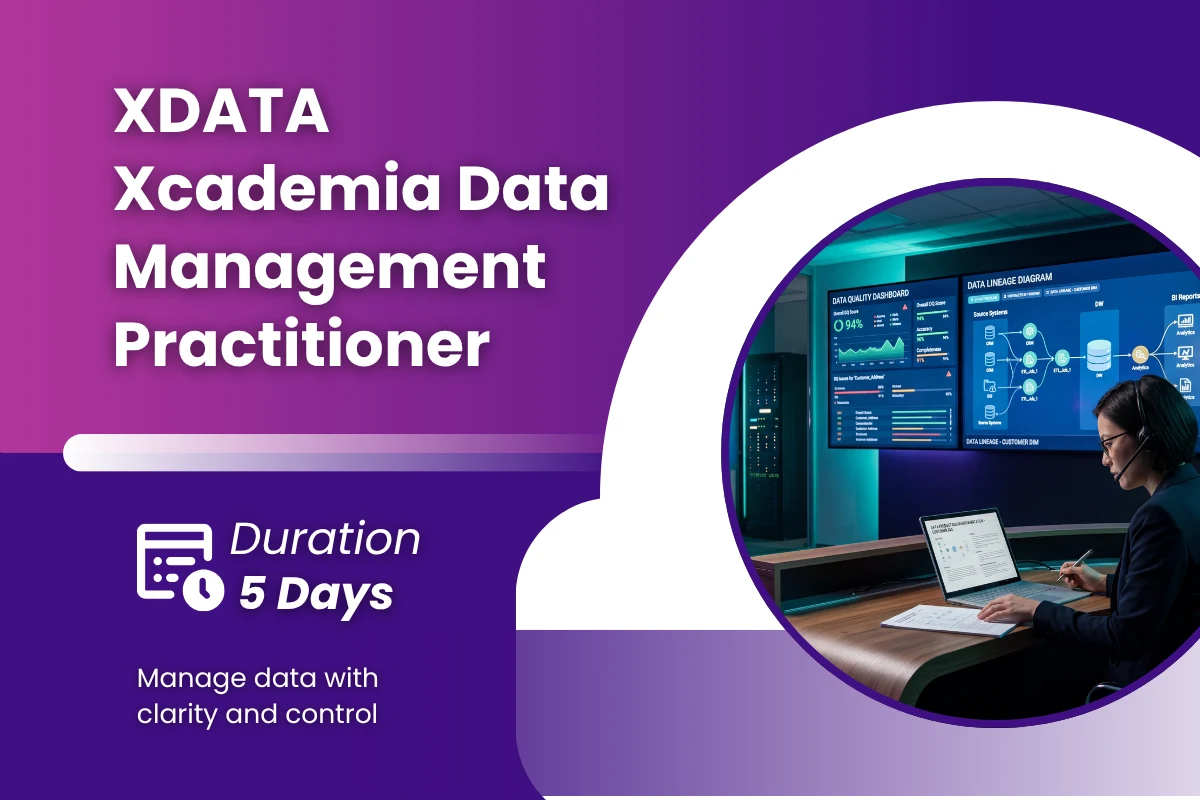 Across five instructor-led days, XDATA covers the core DAMA DMBOK knowledge areas with direct practical application: data governance programme design, data quality lifecycle management, data architecture and data modelling, master data and reference data management, data integration, metadata management, data security and privacy governance, business intelligence data management, and modern data architecture patterns including data mesh and data lakehouse. The programme reflects 2025 data management realities — cloud-native data platforms, AI/ML data governance, and data product thinking.